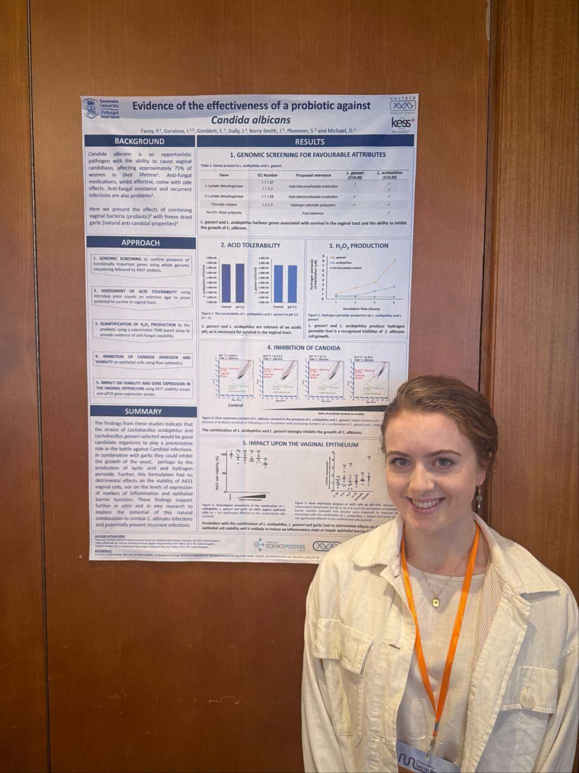 Candida albicans is an opportunistic pathogen capable of causing vaginal candidiasis. While anti-fungal medications are effective, they may cause side effects, recurrent infections and potential anti-fungal resistance. Esther presented in vitro data, showing the beneficial effects of two Lab4 strains, Lactobacillus gasseri CUL09 and Lactobacillus acidophilus CUL60 (producers of lactic acid and hydrogen peroxide), in combination with natural anti-fungal garlic on inhibition of C. albicans growth. Importantly, there were no detrimental effects on the viability, inflammatory state, or gut barrier function, indicating no significant risk of inflammatory response or microbial translocation.